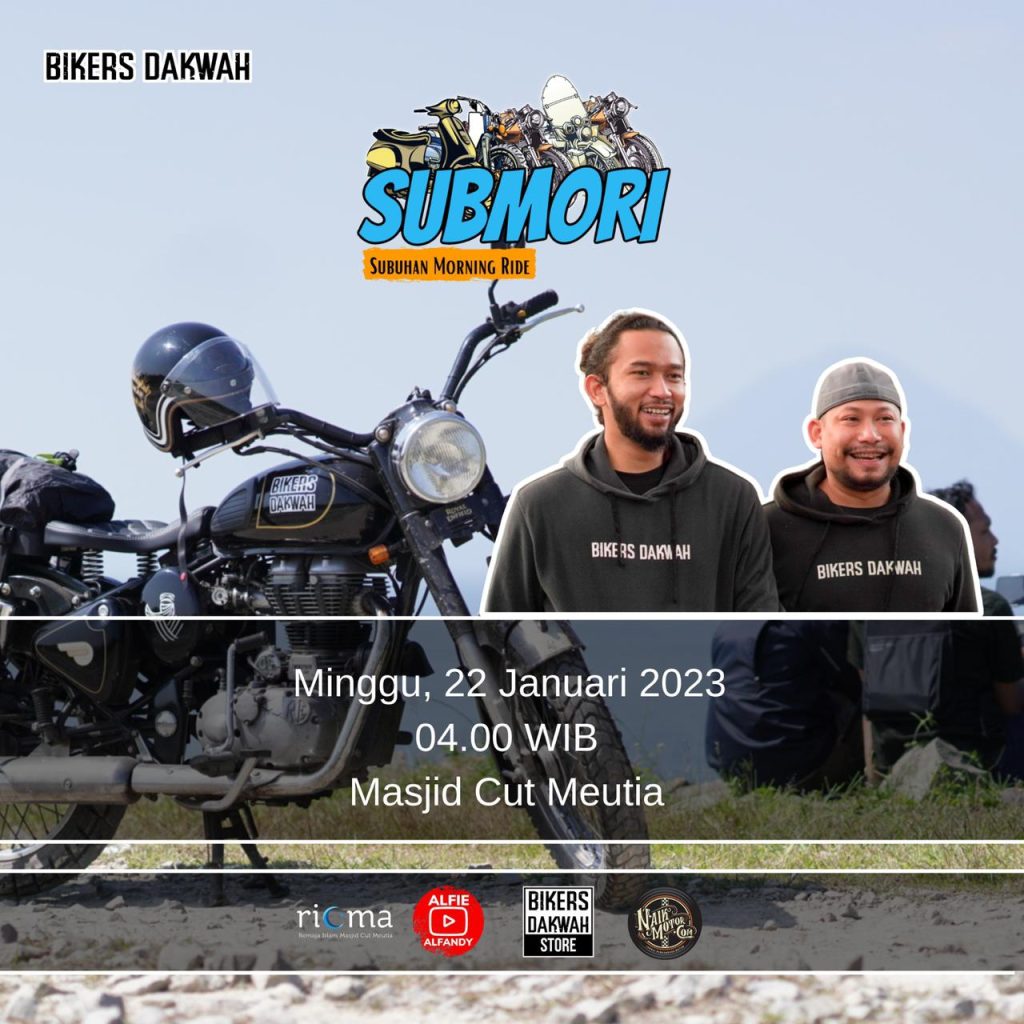 Bertemu lagi kita di acara rutin setiap bulan yaitu SUBMORI (SUBuhan MOrning RIde) dengan agenda acara SUBUH berjamaah, lalu mendengarkan kajian ba’da SUBUH yang Inshallah akan di isi Ust. Alfie Alfandy dan Ust. Fuqri Ruchyat, dan inshallah akan dilanjutkan riding bersama.